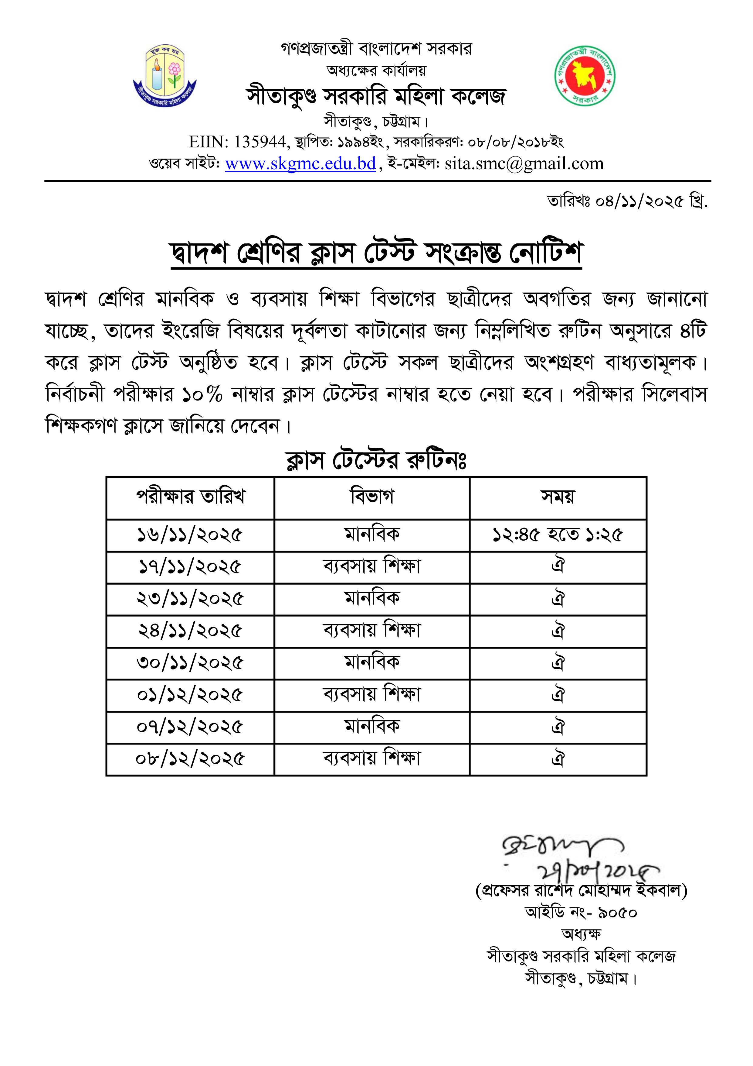 দ্বাদশ শ্রেণির ক্লাস টেস্ট সংক্রান্ত নোটিশ