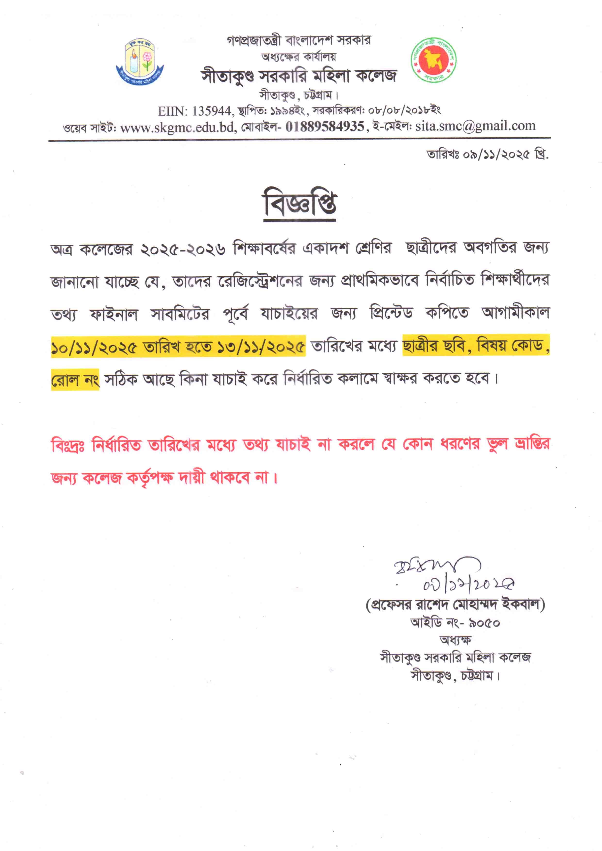 ২০২৪-২০২৫ শিক্ষাবর্ষের স্নাতক (পাস) ১ম বর্ষে ভর্তিকৃত ছাত্রীদের ক্লাস সংক্রান্ত নোটিশ