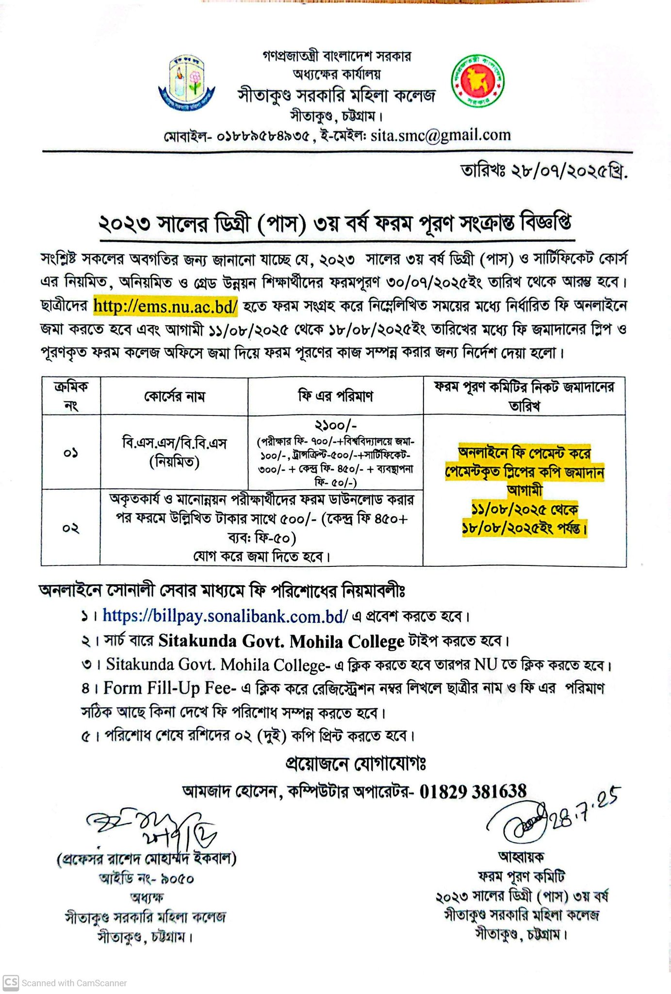 40| ২০২৩ সালের ডিগ্রী (পাস) ৩য় বর্ষ ফরম পূরণ সংক্রান্ত বিজ্ঞপ্তি