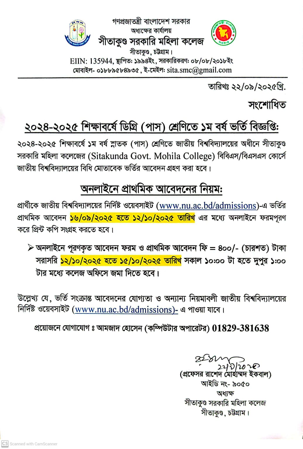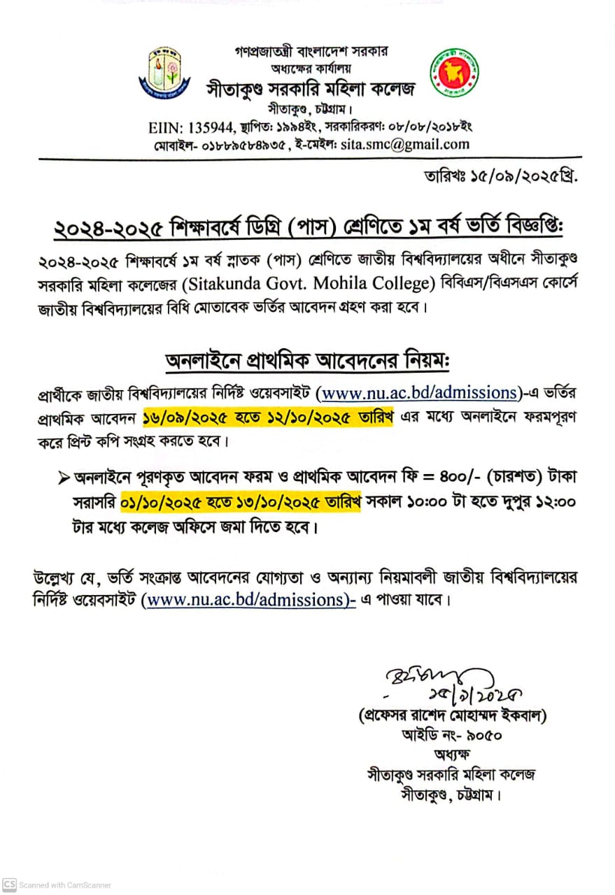 42| ২০২৪-২০২৫ শিক্ষাবর্ষে ডিগ্রি (পাস) শ্রেণিতে ১ম বর্ষ ভর্তি সংক্রান্ত বিজ্ঞপ্তি: